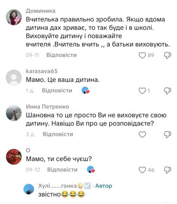 "Вчителька правильно зробила. Якщо вдома дитина дах зриває, то так буде і в школі. Виховуйте дитину і поважайте вчителя .Вчитель вчить, а батьки виховують".