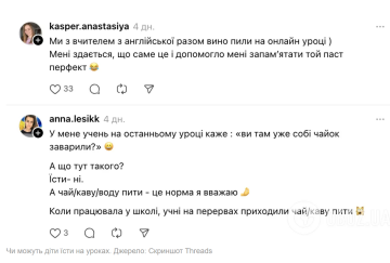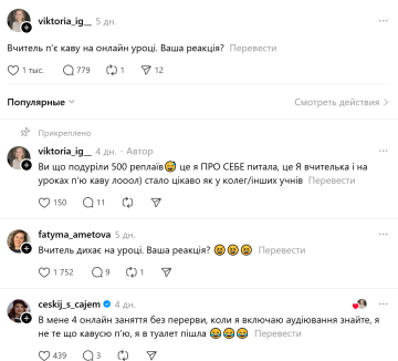 Вікторія Ігнатьєва, яка сама часто проводить уроки з чашкою кави поруч, запитала про реакцію спільноти. Відповіді виявилися несподівано різноманітними: хтось згадував університетські лекції, де викладачі дозволяли навіть їсти, а іноді і пригощали студентів цукерками, хтось поділився досвідом з-за кордону, де на уроках іноземних мов каву приносили і вчителі, і студенти — і ніхто не робив з цього трагедії.