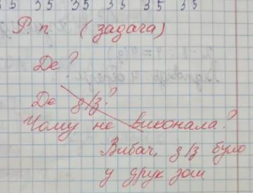 ПодписатьсяМама украинской школьницы Валерия, которая в соцсети Threads имеет никнейм lerochka_kr, обнародовала фото тетради своей дочери, на странице которой учительница сделала надпись с извинением. Педагогиня сначала сделала замечание ребенку из-за отсутствия домашнего задания, но впоследствии признала, что ошиблась, поскольку задача должна была быть выполнена в печатной тетради.